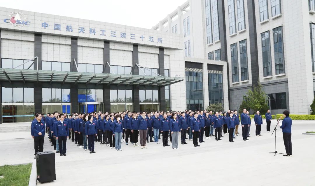 國旗護衛隊英姿颯爽、步伐鏗鏘,昂首闊步走向升旗臺。伴隨著雄壯的國歌和航天科工之歌,五星紅旗、集團公司司旗和三院院旗冉冉升起,在場的干部職工肅立行注目禮。