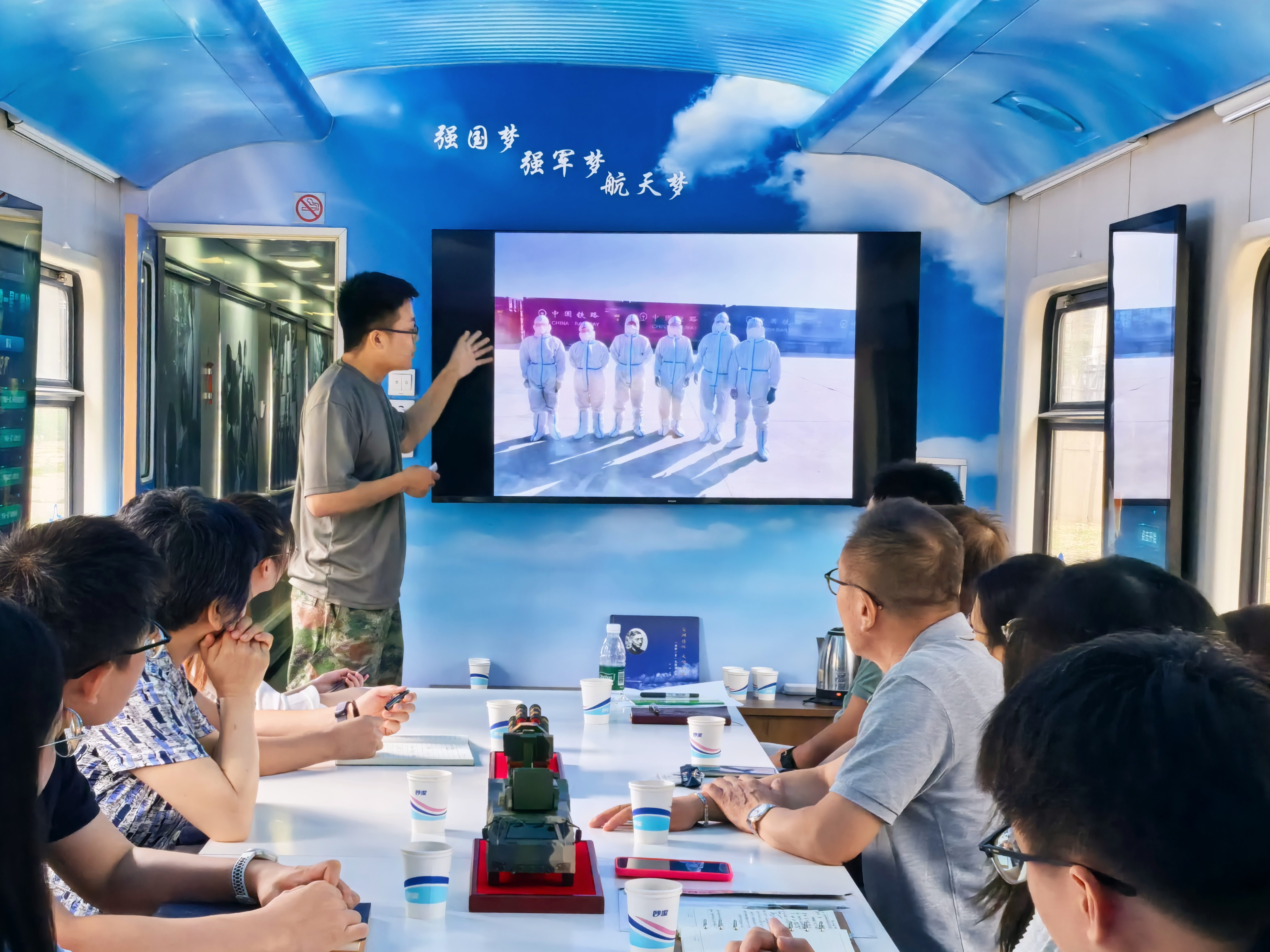 活動(dòng)伊始,大家踏上“紅藍(lán)專列”。這是中天鵬宇公司以自營(yíng)多年、奔波馳騁在轉(zhuǎn)運(yùn)戰(zhàn)線上的鐵路自備車為載體而建成的數(shù)字化黨建文化移動(dòng)陣地和“兩彈一星”精神傳播陣地。在“紅色專列”上,大家依次參觀了“初心學(xué)堂”“偉大歷程”和“航天報(bào)國(guó)”三個(gè)展區(qū),通過(guò)數(shù)字化顯示屏和展板載體、全景式噴繪和實(shí)物布展,沉浸式感受偉大的建黨精神,體悟蘊(yùn)含其中的信仰力量、精神力量和傳承力量;在“藍(lán)色專列”上,大家通過(guò)參觀“功勛引領(lǐng)”“筑夢(mèng)之路”“歷史光影”“精神傳承”和“互動(dòng)問(wèn)答”五個(gè)板塊,“瞻其人、觀其程、學(xué)其神、聽其聲、覺(jué)其思”,深入感悟“兩彈一星”精神的深刻內(nèi)涵和時(shí)代價(jià)值。