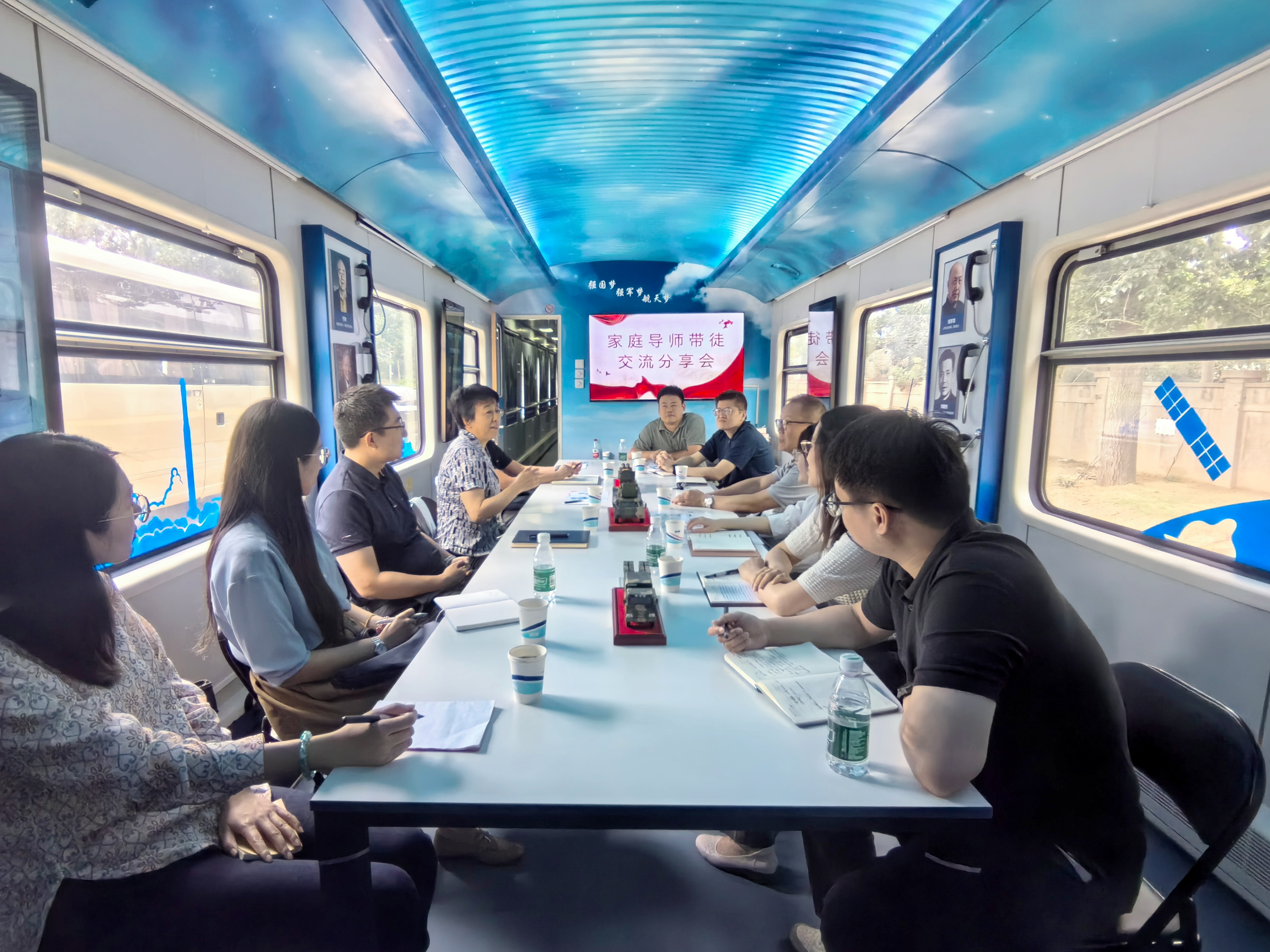 為加強(qiáng)航天二院青年人才隊(duì)伍建設(shè),充分發(fā)揮家庭導(dǎo)師引路人的作用,航天二院?jiǎn)?dòng)家庭導(dǎo)師帶徒工作。7月24日,活動(dòng)第三站來(lái)到中天鵬宇公司“紅藍(lán)專列”,開啟了一場(chǎng)跨越時(shí)空,航天精神薪火相傳的沉浸式現(xiàn)場(chǎng)教學(xué)。二院原黨委書記、家庭導(dǎo)師馬杰和她的六個(gè)徒弟,二院團(tuán)委書記王雷,中天鵬宇公司黨委書記李進(jìn)、黨委副書記李辰穎和相關(guān)單位團(tuán)委書記參加此次活動(dòng)。